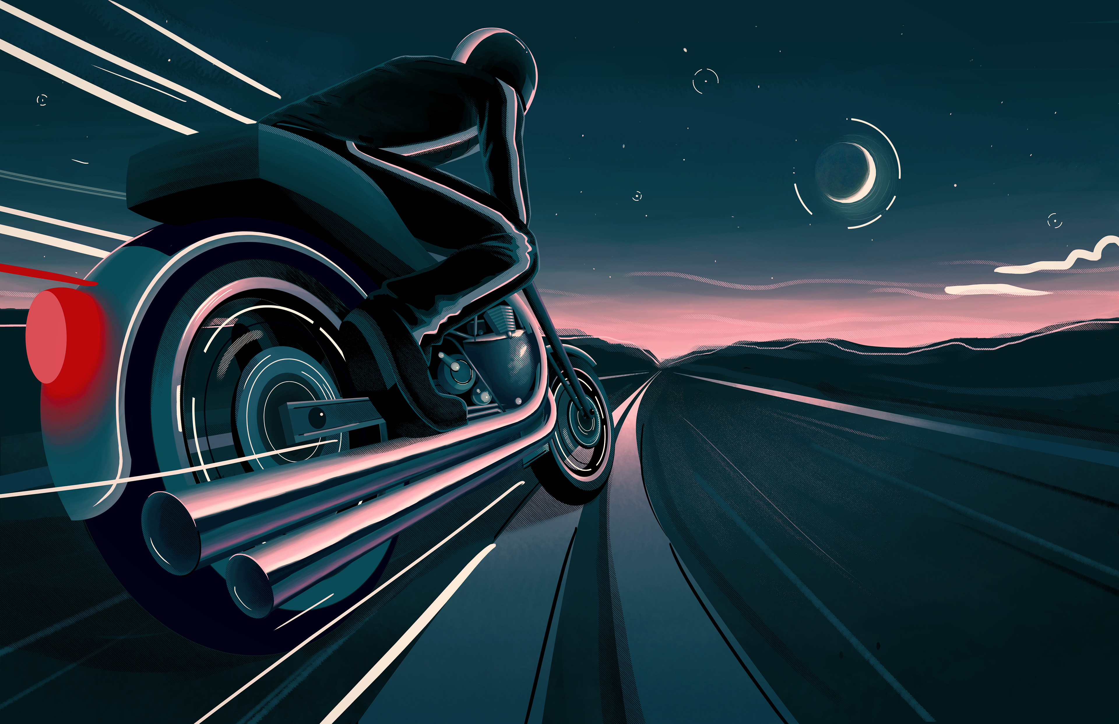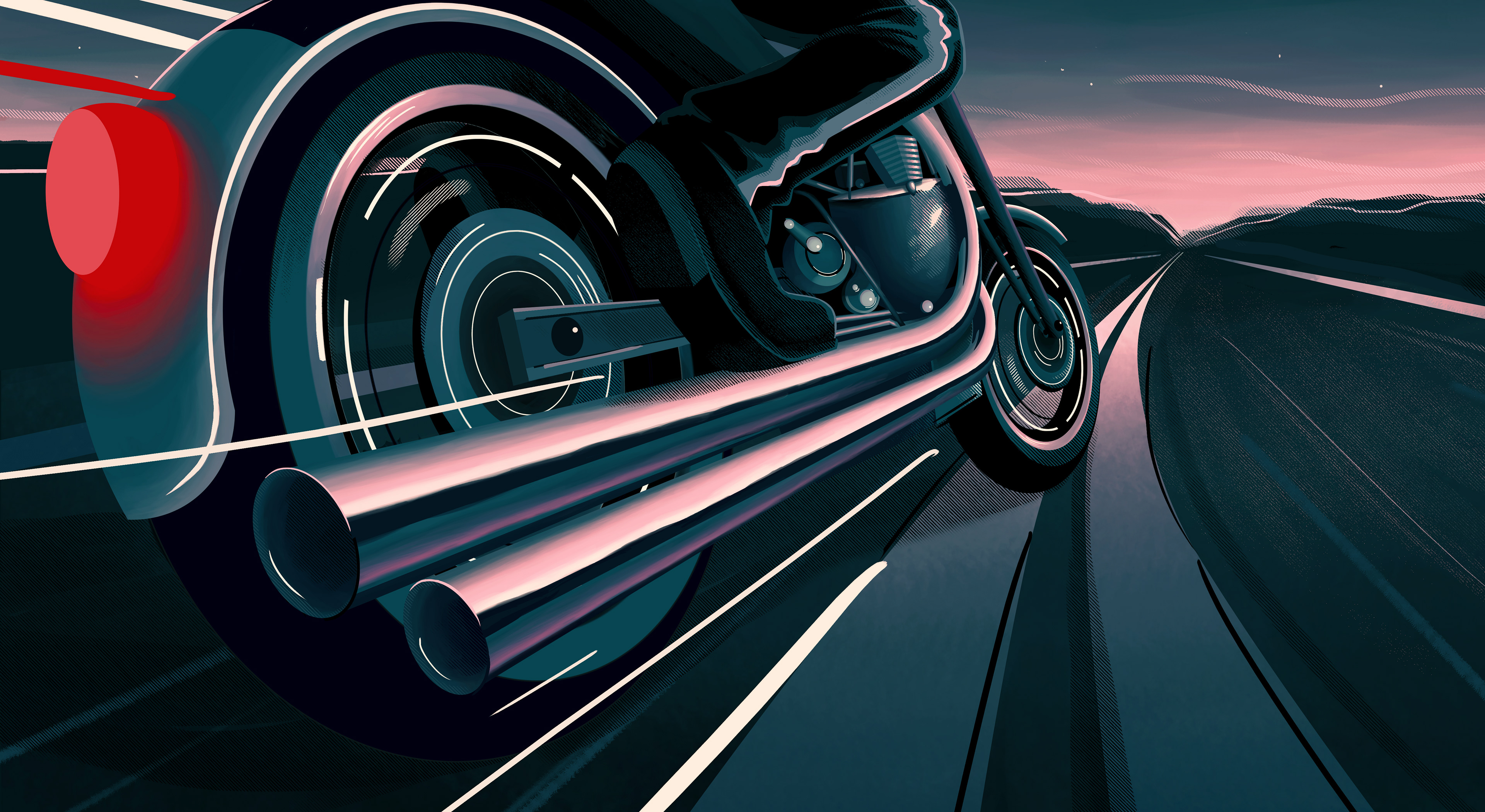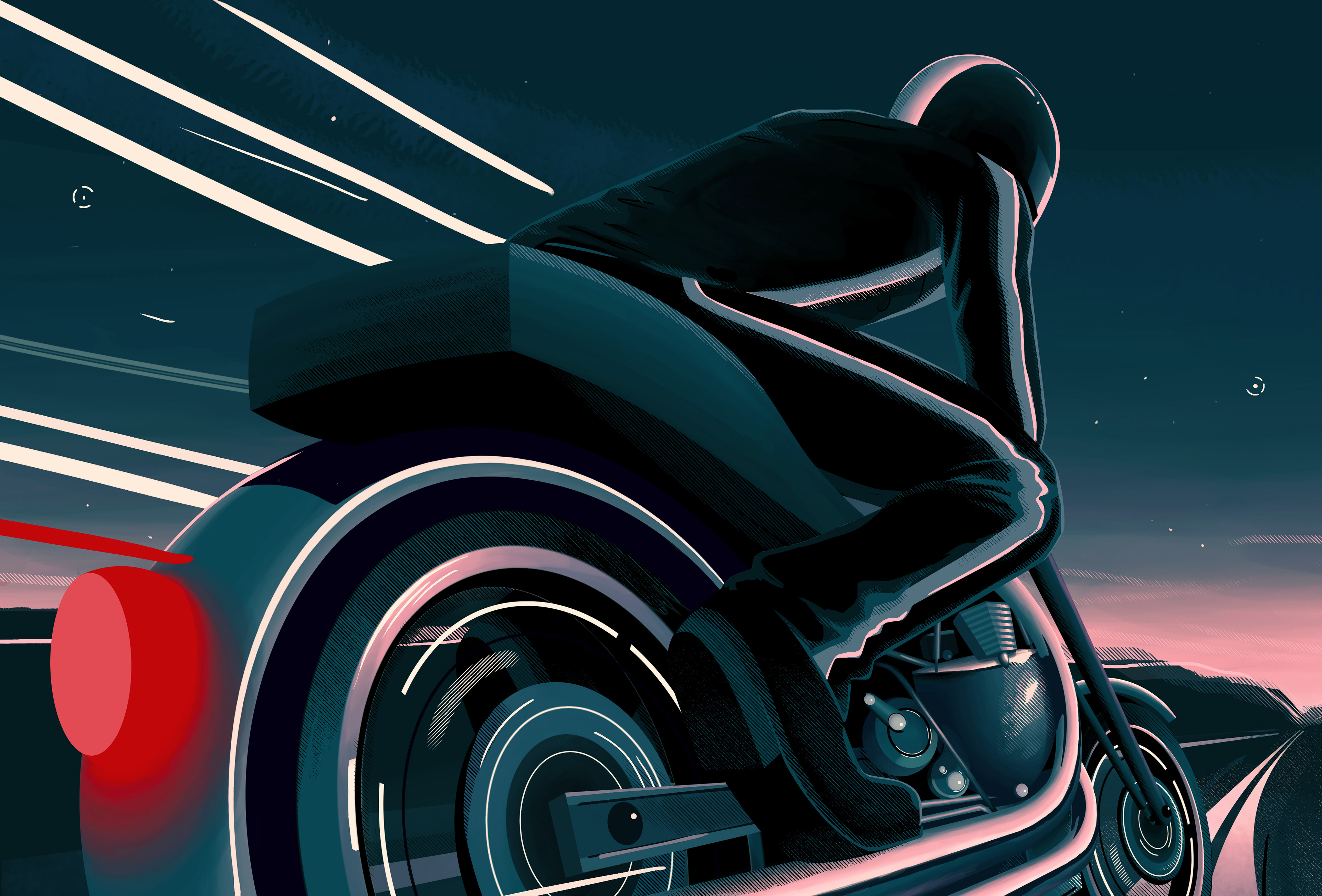 This editorial illustration was inspired by the song 1952 Vincent Black Lightning by Richard Thompson. The angle of the camera and flying speed were meant to show the rider's power and the freedom of the open road.